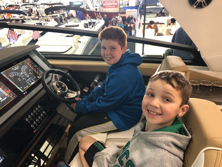 Where else can they pretend to drive such awesome machines? They spend the entire show exploring and noting the different types of boats, comparing the cabins, and dreaming about where everyone would sleep in each one. They are amazed at how much horsepower the different boats have and are naturally drawn to the biggest and most imposing ones.