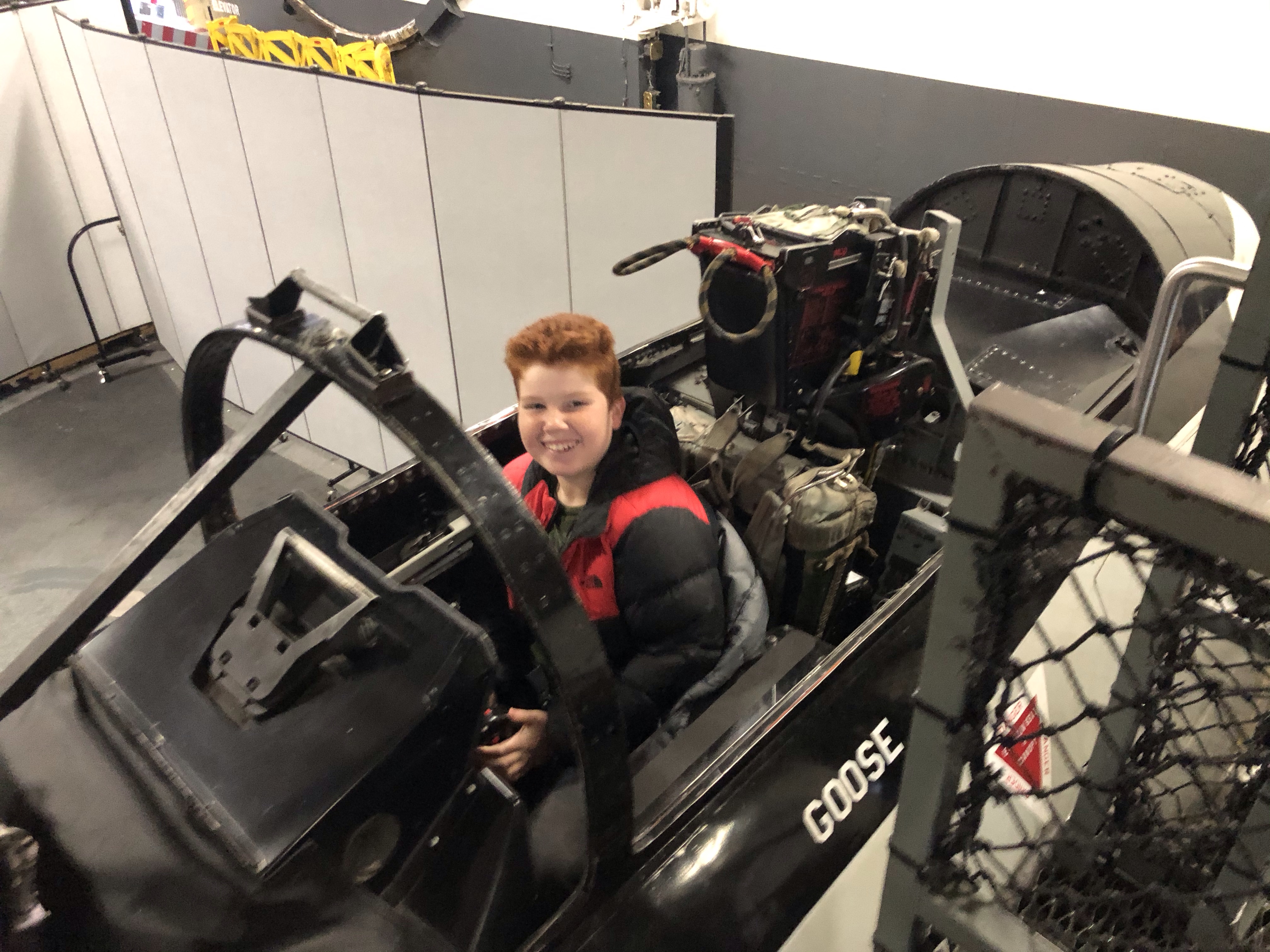 It was only about 5 minutes to get through security since we didn’t have any bags to be searched. They scanned our tickets and we were on quickly onto the hanger deck of the USS Midway. It was enormous and filled with planes of all vintages. There were several planes and cutouts of planes you could sit in and take pictures of. The boys of course found one they wanted to try. It was a replica of the Top Gun cockpit so it was popular, but we got in before a big rush of people.