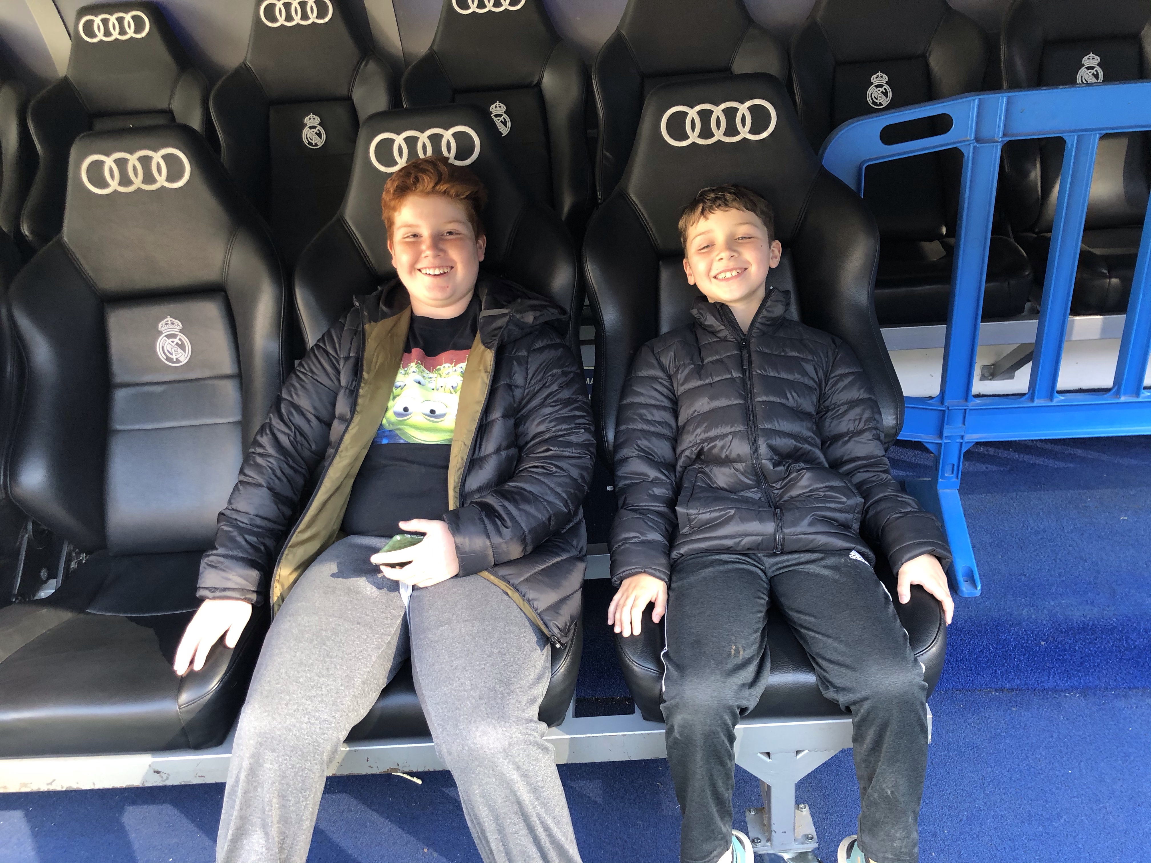 Next on the tour we wound our way through the VIP sections and then down into the lower levels where we got to walk through the Real Madrid dressing room. It was neat to think that it was where countless famous athletes had called home during past seasons. From there we walked out the player tunnel out to the team benches and right up to (but not on!) the field. We even got to sit on the super cool seats. They are as comfortable and supportive as they look!